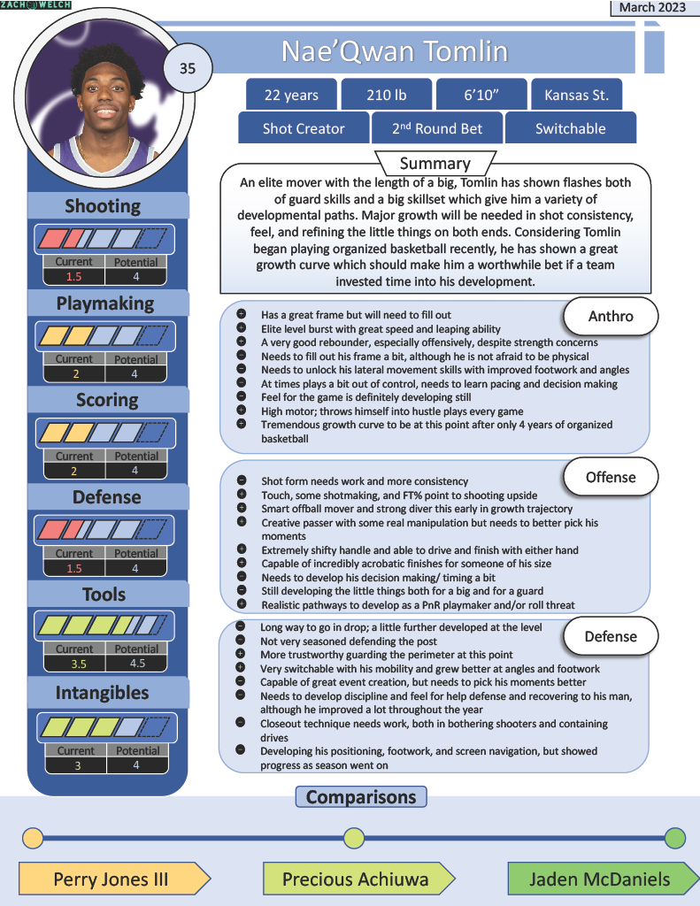 Every year, I conduct a thorough scouting process involving as much high school, college, and pro scouting as possible, combined with a consideration for analytics and intel. I developed my own scouting report template, harnessing my academic background in design and professional background in scouting to form a new way to evaluate and project prospects. I aimed to strike a balance here between being concise and effective, but also diving in-depth with each prospect. The result was a seven page report in which the first page can be taken as a standalone and complete report on the prospect in and of itself, but for readers looking to understand the prospect in greater depth, each of the ensuing pages presents color-coded evaluations of categorized microskills.